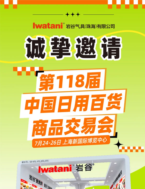 第117屆中國日用百貨商品交易會將于2024年7月18日-7月20日在上海新國際博覽中心隆重舉辦,巖谷氣具受邀參加展會,展位號:N2-B05。